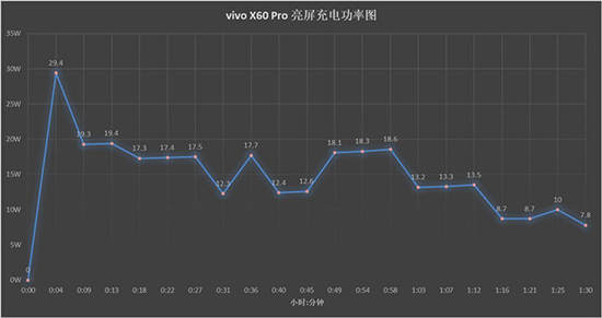 充電功率方面,vivo X60 Pro僅用時4分31秒就達到了峰值的29.4W,隨后充電功率開始下降,并在12-19W范圍內(nèi)反復(fù)波動,并在充滿后功率瞬間歸零。