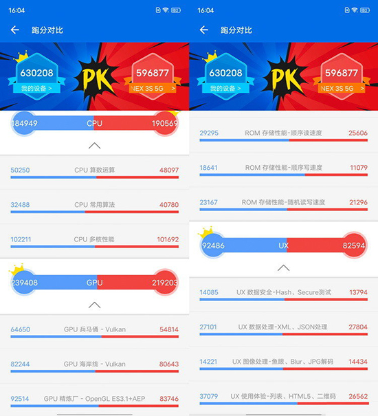其次,當(dāng)我們將X60 Pro的跑分,與采用驍龍865方案的NEX3S進(jìn)行對比時(shí),可以看到,Exynos 1080的CPU部分與這款經(jīng)典的旗艦主控性能基本相當(dāng),但其3D游戲性能方面甚至還要再高上一點(diǎn)點(diǎn)。除此之外,得益于更新的架構(gòu)和更快的UFS3.1閃存,Exynos 1080驅(qū)動下的X60 Pro,在磁盤讀寫性能與日常使用場景的測試中,都取得了優(yōu)勝。