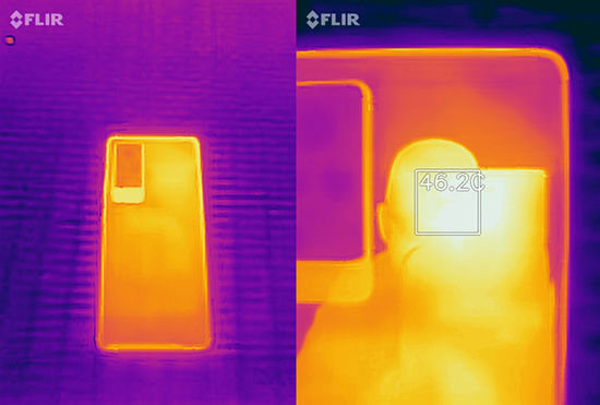 可以看到發(fā)熱的區(qū)域主要在攝像頭附近,最高溫度為46-47°C。這一情況和iPhone12ProMax差不多,后者的溫度達到了45-47°C左右。