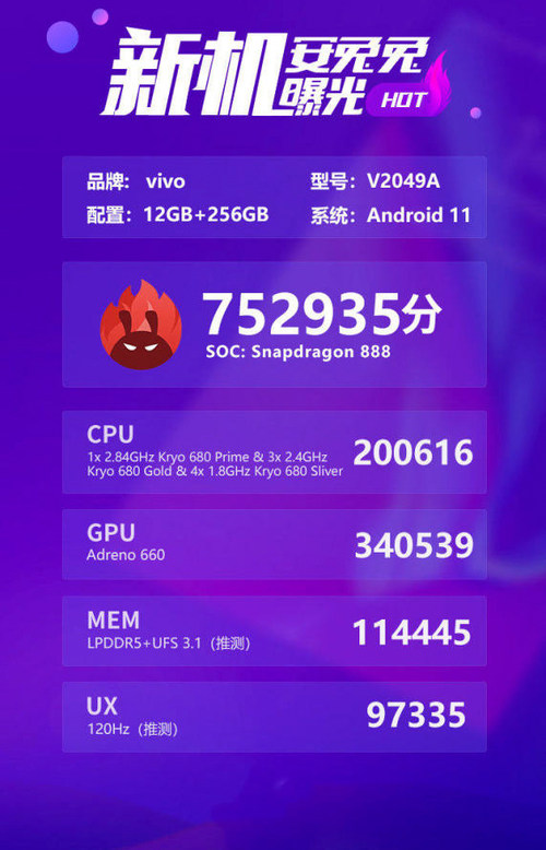 前段時(shí)間高通剛發(fā)布驍龍888,iQOO方面就表示會作為首批采用該平臺的品牌。果不其然,在2020年還有一天之際,iQOO 7正式官宣曝光,iQOO 7搭載的是高通驍龍888處理器。新機(jī)將于1月11日正式發(fā)布,有網(wǎng)友已經(jīng)挖到了安兔兔方面發(fā)布的跑分,接近76萬的分?jǐn)?shù)超過了日前上市的小米11。