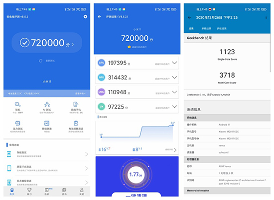 跑分方面,我手里的小米11 12GB+256GB版本安兔兔達(dá)到了72萬(wàn)分,是目前安卓數(shù)據(jù)庫(kù)中最高分?jǐn)?shù)。GeekBench 5,單核1123,多核3718,也比麒麟9000要高一些。