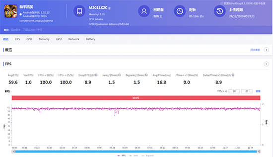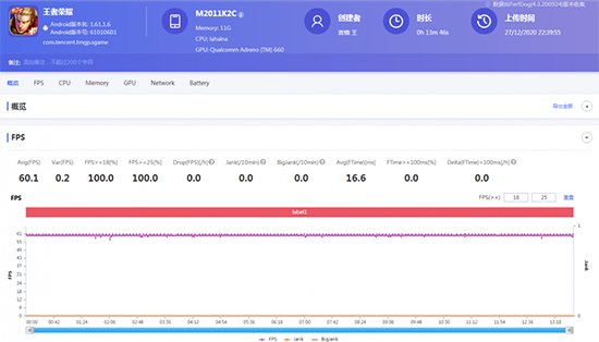 實(shí)際游戲體驗(yàn)方面, 王者榮耀最高畫(huà)質(zhì),毫無(wú)波瀾,14分鐘游戲,最低幀率56.9,最高幀率61,平均幀率達(dá)到了60.1。和平精英,HDR高清+極限幀率,一樣相當(dāng)穩(wěn)定,最低幀率48,平均幀率59.6。功耗也表現(xiàn)不錯(cuò),僅僅是溫溫?zé)岫?,看?lái)這兩款主流游戲不足以發(fā)揮小米11真正的性能實(shí)力。