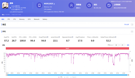 那么連iPhone都能跪下的原神表現(xiàn)又能如何呢?在效果全開(kāi)的游戲模式下,游戲17分鐘,小米11基本能夠穩(wěn)定流暢的運(yùn)行,偶有突然掉幀的情況,最低幀率21,平均幀率達(dá)到了57.2??梢哉f(shuō)是目前玩原神這款游戲,表現(xiàn)最好的手機(jī),沒(méi)有之一。溫控方面,小米11也是非常出色,正面最高42.1℃,背面最高41.2℃。驍龍888在功耗的表現(xiàn),確實(shí)是非常的穩(wěn)。