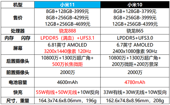 再看看配置上的對比,小米11在核心性能、屏幕、快充方面,可以說是完爆小米10。