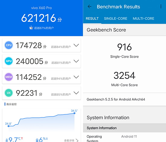 實(shí)測(cè)vivo X60 Pro安兔兔跑分為621216分,魯大師826144分,Geekbench5 單核916分,多核3254分,匹配12GB運(yùn)行內(nèi)存以及256GB機(jī)身存儲(chǔ)(LPDDR4X+UFS3.1),從跑分上來(lái)看,跟旗艦級(jí)驍龍865芯片的跑分差不多,擁有旗艦級(jí)的性能表現(xiàn)。相比上一代采用的驍龍765G芯片,vivo X60 Pro的性能有跨越式提升。日常使用或者玩熱門手游都沒(méi)啥問(wèn)題。
