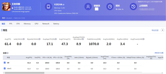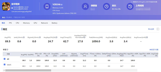 基于對iQOO 5強勁跑分成績的信任,在運行兩款游戲時我們均開啟了最高畫質(zhì)和極限幀率模式,并通過PerfDog性能狗工具來監(jiān)測iQOO 5運行上述兩款游戲時的數(shù)據(jù)變化。從最終的測試結(jié)果來看,在畫質(zhì)全開的情況下,iQOO 5運行王者榮耀與和平精英時的平均幀率分別為61.4幀和89.5幀。