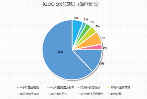 經(jīng)過4個(gè)半小時(shí)的綜合續(xù)航測試之后,iQOO 5剩余電量62%。結(jié)合我們實(shí)際使用的情況來看,即便在重度使用場景下,iQOO 5的電量也能夠滿足一整天的用機(jī)需求。對于“電量焦慮癥”群體來說,這樣的續(xù)航水平算是給人吃了一顆“定心丸”。