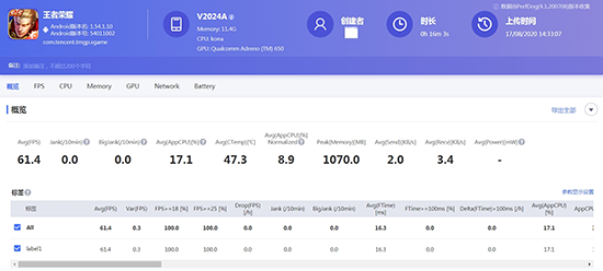 作為一款MOBA手游,《王者榮耀》的熱度可謂是經久不衰,玩家可以通過使用不同的英雄在地圖中進行PVP對戰(zhàn)。如果手機性能有限,在多人團戰(zhàn)時就很容易出現(xiàn)畫面掉幀的情況,游戲體驗也會大打折扣。通過Perfdog監(jiān)控幀率的數(shù)據來看,即便在最高畫質、最高幀率全開的情況下,iQOO 5運行《王者榮耀》時幀率也能夠一直穩(wěn)定保持在60幀左右,平均幀率甚至超出了60幀的上限——達到了61.4幀。由此可見,iQOO 5在特效全開的情況下運行《王者榮耀》,并沒有太大壓力。