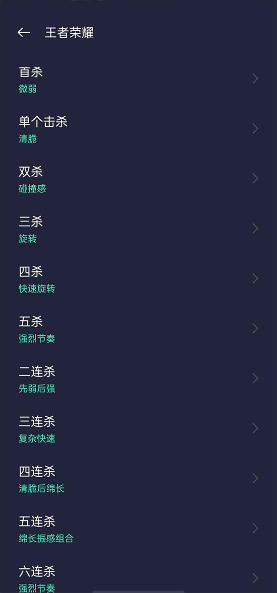 將下方的短橫幅向上滑動,便能開啟對應的設置界面,“4D振感”中提供了10種不同種類的振感反饋,由線性馬達驅(qū)動模擬首殺、單次擊殺至5殺、二連殺至六連殺共計11種擊殺場景。根據(jù)個人習慣的不同,可以將這11種場景按照由弱到強的順序進行設置,可以排除“首殺”或者“六連殺”,來讓10種效果保持相對獨立。