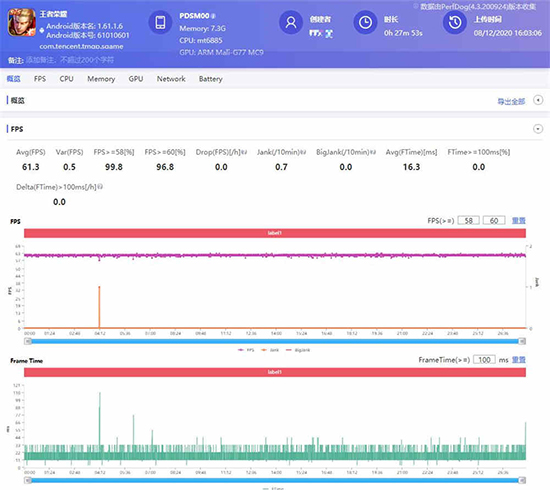 幀率的穩(wěn)定向來是游戲玩家最關(guān)注的參數(shù),它關(guān)系著的是游戲畫面是否流暢。Reno5 Pro擁有旗艦性能的天璣1000 Plus處理器在《王者榮耀》游戲中自然是如魚得水,全滿特效下平均幀數(shù)達(dá)到61.3fps(上限60fps),單幀渲染時長只有一處超過100ms(即實時渲染幀數(shù)為10fps以內(nèi)),造成了游戲過程中的一次卡頓(Jank)。但幀數(shù)軟件的記錄規(guī)則是,當(dāng)畫面出現(xiàn)切換如打開數(shù)據(jù)欄等,幀數(shù)則會出現(xiàn)明顯的波動。