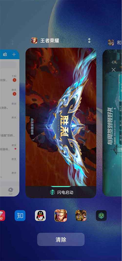 在OPPO Reno5 Pro游戲空間內(nèi)開啟閃電啟動,底部上滑呼出多任務(wù)狀態(tài)時,游戲應(yīng)用下便會出現(xiàn)“閃電啟動”的標志。用目前常見的《王者榮耀》和《和平精英》兩款游戲分別進行測試,閃電啟動的效果非常顯著。
