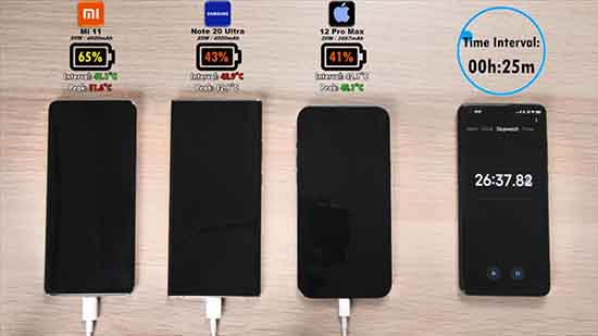 在充電25分鐘之后,小米11、三星Note20 Ultra、iPhone 12 Pro Max這三部手機的電池剩余電量百分比分別為65%、43%、41%,從目前的電池充電速度來看,小米11的電池充電速度排在第一位,iPhone 12 Pro Max處在第三位,不過三星Note20 Ultra和iPhone 12 Pro Max的充電速度差別不大。