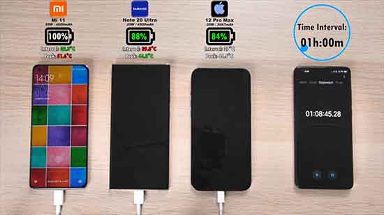 最終小米11、三星Note20 Ultra、iPhone 12 Pro Max這三部手機的充電完成所耗費的時間,分別為1小時9分鐘、1小時17分鐘、1小時56分鐘,而機身電池溫度分別為51.6攝氏度、44.3攝氏度、44.5攝氏度,最終小米11的充電速度最快,iPhone 12 Pro Max的電池充電速度最慢。