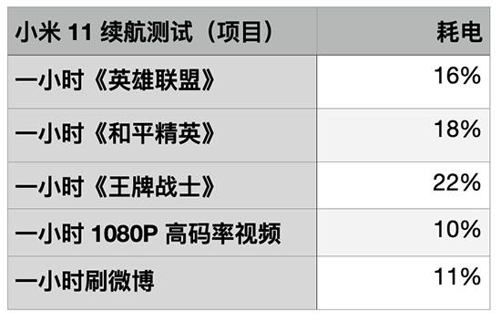 在開(kāi)啟5G以及Wi-Fi網(wǎng)絡(luò),并且屏幕亮度50%的情況下,小米11在三個(gè)游戲以及觀看視頻、瀏覽信息內(nèi)容時(shí)的耗電如以下表格。