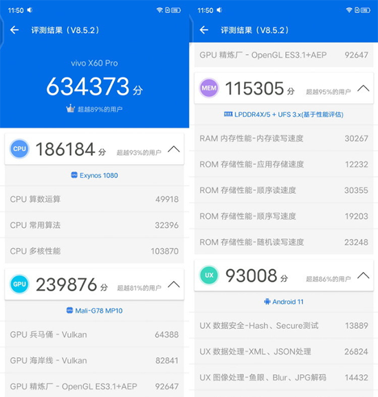 634373分,這就是我們手頭這臺12+256GB版本的X60 Pro在安兔兔評測中的最終成績。首先從總分來看,這個成績已經(jīng)超過了大多數(shù)采用驍龍865平臺的機(jī)型,也碾壓了2020年大紅大紫的旗艦級平臺天璣1000+。