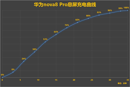 據(jù)華為實驗室數(shù)據(jù),華為nova8 Pro用原裝充電器充電,15分鐘可充電60%,35分鐘可充滿100%。我們實際測試則是15分鐘可充電64%,35分鐘可充滿100%,這與華為的實驗室的數(shù)據(jù)非常接近。