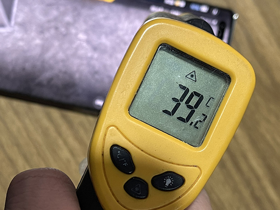 用華為nova8 Pro連續(xù)吃雞三局,耗時約40分鐘。在這40分鐘左右的游戲時間里,體感上來說,沒有明顯的發(fā)熱發(fā)燙現(xiàn)象。第三局游戲結束后,我們評測員用測溫槍進行了測溫,無論是正面還是背面,溫度都不高。其中,正面最高溫度39.2℃,背面最高溫度38.4℃,對于打游戲這種操作來說,屬于很低的溫度。