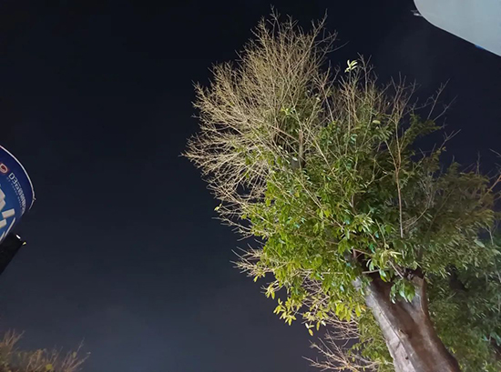 換到暗光環(huán)境,成像風(fēng)格基本延續(xù)白天,在光線還算充足的環(huán)境下,realme真我V15的各路細(xì)節(jié)還算能接受的,除了燈箱、燈光泛光較嚴(yán)重外,受光物體的細(xì)節(jié)可辨,包括樹上的細(xì)節(jié)也還算不錯;在光線較為極端的環(huán)境下,V15的暗處表現(xiàn)有點不堪,跟旗艦機有著不少的距離。