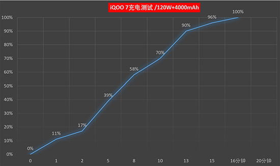 實(shí)測(cè),iQOO 7從關(guān)機(jī)時(shí)開(kāi)始充電,充電10分鐘時(shí)電量已經(jīng)達(dá)到了70%,從0到100%充滿只需要16分鐘,更準(zhǔn)確的說(shuō),是不到16分鐘的時(shí)間。這個(gè)充電速度比曾測(cè)過(guò)的iQOO 5 Pro(同樣120W、4000mAh電池)還要快一分鐘左右。