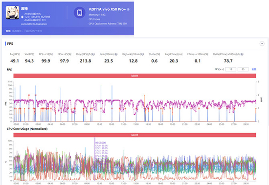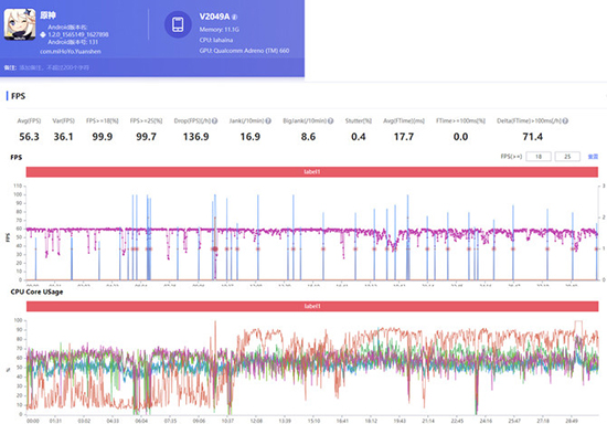 《原神》在自定義畫(huà)質(zhì)拉滿(mǎn)的情況下,試玩30分鐘后能明顯感覺(jué)出現(xiàn)了畫(huà)面卡頓的情況,但實(shí)測(cè)發(fā)現(xiàn)幀數(shù)能一直穩(wěn)定在55-60fps,不會(huì)出現(xiàn)搭載驍龍865機(jī)型玩《原神》出現(xiàn)斷崖式浮動(dòng)掉幀的情況。