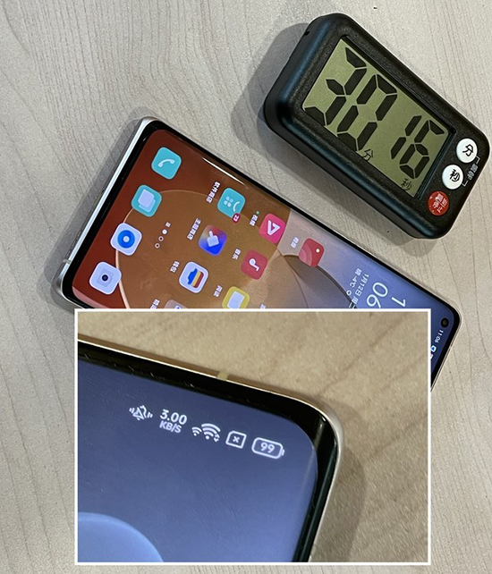 根據測試記錄的數據,OPPO Reno5 Pro+在持續(xù)的低溫環(huán)境下表現出了良好的續(xù)航水平,在30分鐘的冰凍之后其電池電量僅下降了1%。放入前電量100%,30分鐘剩余后電量99%,并沒有出現因長時間處于低溫環(huán)境導致電量大幅下滑的問題。