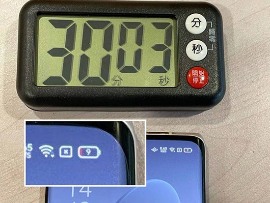 接下來,回到室內便要進行更為嚴酷的30分鐘冰凍測試。在本項測試中,將OPPO Reno5 Pro+放置在溫度為零下22攝氏度的冰箱冷凍室中靜置30分鐘,并每隔10分鐘記錄一次剩余電量,以考驗其面對嚴寒時的續(xù)航性能。