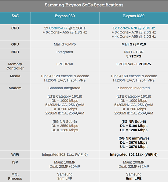 看到不少的用戶在關(guān)注這個vivo X60 Pro手機,就是不知道這個手機的性能處于什么水平,根據(jù)AnandTech整理的表格可以看出,三星Exynos 1080是三星首款5nm工藝的旗艦soc;它還在業(yè)內(nèi)首發(fā)了ARM最新的Cortex-A78架構(gòu),大核頻率高達2.8GHz;GPU也從上代的5核G76升級為10核G78。從規(guī)格就可以預(yù)見,其性能對比前代的Exynos 980將獲得巨大幅度的提升。