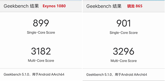 在安兔兔V8.5.2測試中,Exynos 1080獲得約61.7萬分,確實十分接近于驍龍865的65.3萬分,二者的差距主要體現(xiàn)在GPU上,但也幾乎可以說是同級別的性能水準。