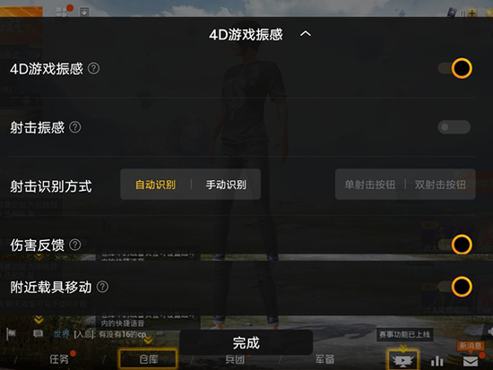 開(kāi)啟自動(dòng)識(shí)別模式時(shí),游戲有三種振動(dòng)場(chǎng)景:射擊時(shí)、被打時(shí)、附近車輛開(kāi)過(guò)時(shí)。射擊振動(dòng)反饋和被打振動(dòng)反饋不能被同時(shí)開(kāi)啟。這應(yīng)該是考慮到和敵人對(duì)槍時(shí)會(huì)發(fā)生同時(shí)開(kāi)槍和被打的情況,振動(dòng)馬達(dá)“忙不過(guò)來(lái)”。當(dāng)然,大家也可以選擇關(guān)閉所有振動(dòng)反饋。