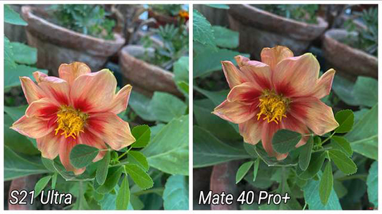 在這組以花作為被拍攝主體,進(jìn)行的拍照對比中。三星S21 Ultra和華為Mate40 Pro+之間的拍照區(qū)別,也是十分明顯的。華為Mate40 Pro+拍攝的照片中的花朵,整體的曝光度較低,而且花瓣顏色比較暗,同時綠葉的顏色也比較暗,不夠鮮艷。三星S21 Ultra拍攝的照片中,花瓣和綠葉的整體亮度比較高,同時顏色方面也非常鮮艷。