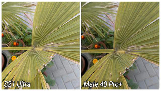同樣的在室外環(huán)境中的,以植物作為被拍攝對象的拍照對比,三星S21 Ultra拍攝的照片中,芭蕉葉的顏色比較亮,而華為Mate40 Pro+拍攝的照片中的芭蕉葉則比較暗,除了明暗區(qū)別之外,在顏色方面也有著非常明顯的區(qū)別,三星S21 Ultra拍攝的照片中的芭蕉葉偏黃色多一些,華為Mate40 Pro+拍攝的芭蕉葉則整體是墨綠色。