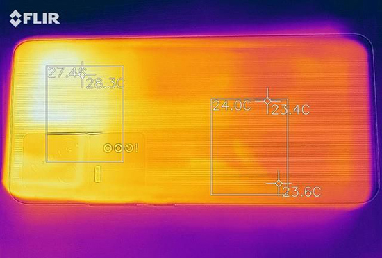 與沒(méi)有采用均熱板的產(chǎn)品相比,iQOO 7的表面溫度可以降低4℃,CPU溫度可以降低14℃。而當(dāng)室內(nèi)溫度較低,維持在6℃左右進(jìn)行和平精英溫度測(cè)試過(guò)程中,運(yùn)行5分鐘時(shí)手機(jī)背部最高溫度為28.3℃,運(yùn)行20分鐘后機(jī)身最高溫度為28.5℃,并沒(méi)有明顯溫度差異。
