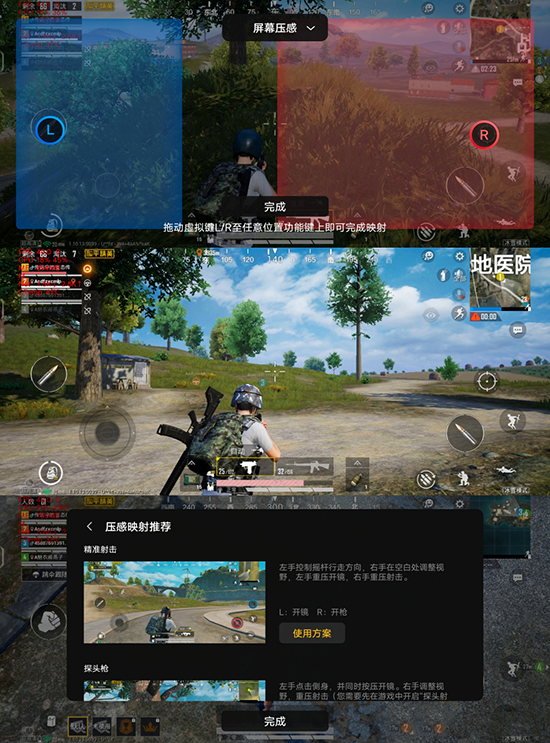 在實(shí)際操作中,iQOO 7實(shí)際在屏幕上為玩家提供了左右兩側(cè)輕觸+壓感共4顆“按鍵”,玩家在正常操作的情況下,直接用力下壓即可觸發(fā)另一操作。比如在《和平精英》中,玩家可以將左側(cè)壓感映射為開鏡,右側(cè)壓感映射為開火,在碰到敵人的情況操作方向的左手大拇指可以直接重壓開鏡,右手大拇指瞄準(zhǔn)后直接重壓開火,可以簡(jiǎn)單地用雙指實(shí)現(xiàn)四指操作,極大地提升玩家的技戰(zhàn)術(shù)水平與游戲體驗(yàn),這也是官方稱其為『無影手柄』的原因。而且相較于2顆額外的肩鍵,雙壓感觸控觸發(fā)也更符合直覺,此外iQOO 7還內(nèi)置了多個(gè)專業(yè)的壓感映射設(shè)置,可以一鍵啟用,進(jìn)一步降低了玩家上手成本。當(dāng)然因?yàn)榭梢宰杂捎成?,所以理論上雙壓感觸控可以無縫適配任何手游,對(duì)于一些難度較高的單機(jī)諸如《帕斯卡契約》應(yīng)該也有著不錯(cuò)的功用。