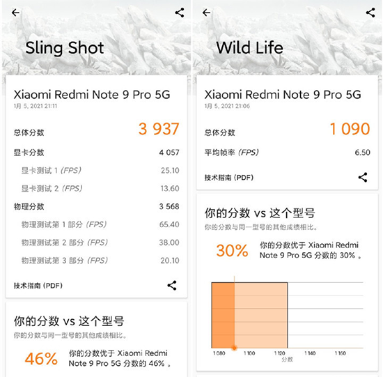 3DMark測試中 Sling Shot場景下3937分 Wild Life場景下 1090分