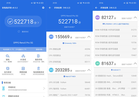 我們來看看Reno5 Pro在安兔兔v8.5.2上的跑分成績,超過52W的分?jǐn)?shù)讓我感到非常滿意,這個分?jǐn)?shù)甚至比我之前評測的另外一臺使用天璣1000+的手機(jī)還高出了1W多分。雖然在跑分上和最新的驍龍888、麒麟9000等處理器還有差距,但也超過了麒麟990 5G、驍龍765G等較老的處理器。我們繼續(xù)從截圖中看看CPU、GPU、MEM、UX等子項的分?jǐn)?shù)。