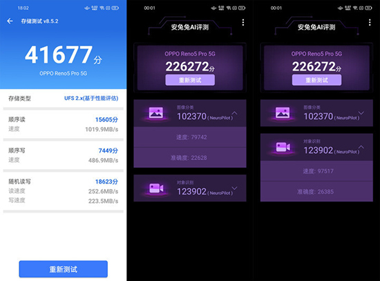 在內(nèi)存測試和AI測試上,可看到Reno5 Pro采用了UFS 2.x的版本,雖然在讀寫速度上和采用UFS3.0/3.1的機(jī)型有明顯的區(qū)別,但是日常使用也足夠。AI測試上,Reno5 Pro在安兔兔AI(版本號:1.3.2)中跑分超過22W分,AI性能中規(guī)中矩,我們可以看看圖像分類和對象識別的子項分?jǐn)?shù)。