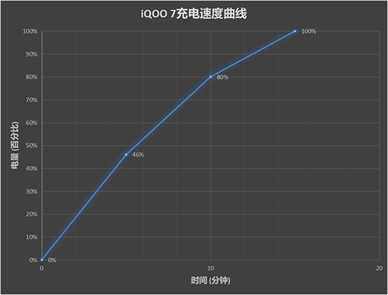 經(jīng)過(guò)筆者實(shí)測(cè),iQOO 7從手機(jī)0%熄屏關(guān)機(jī)開(kāi)始充電,剛好15分鐘的時(shí)間可以把4000mAh的電量完全充滿,0-5分鐘的時(shí)候充至46%,0-10分鐘的時(shí)候充至80%,效率驚人,看來(lái)以后的充電數(shù)據(jù)圖要精確到1分鐘的時(shí)間間隔來(lái)計(jì)入了,不然一個(gè)不留神,手機(jī)的電就充滿了。