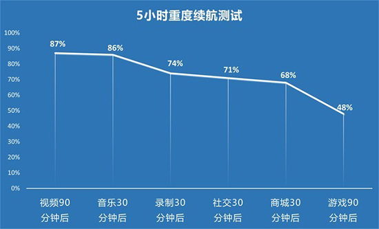 而在續(xù)航測試中,我們把屏幕亮度和外放音量固定在50%,連續(xù)看了B站1080P視頻、聽了在線音樂、錄了30分鐘視頻(默認(rèn)相機(jī)設(shè)置)、刷了30分鐘微博、逛了30分鐘淘寶,玩了90分鐘《和平精英》(默認(rèn)畫質(zhì)),5個(gè)小時(shí)后電量剩余48%。