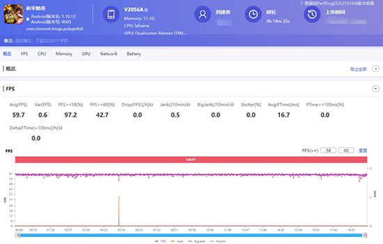 接近20分鐘的游戲時間里,平均幀率達到了59.7幀,另有97.2%的時間段達到了58幀,這就意味著筆者測試的這局游戲全局都接近滿幀。透過幀率曲線,可以發(fā)現(xiàn)曲線非常平衡,除了最后結(jié)算頁面,真的沒有特別大的范圍波動,畢竟幀率方差也只有可憐的0.6,方差越小說明波動就越小。就實際的游戲體驗而言,操作非常流暢,體感上沒有任何卡頓。