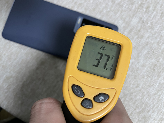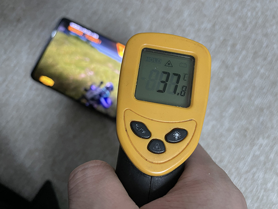 玩了三局《和平精英》(都有進決賽圈或準決賽圈,時長約1小時),體感上機身沒有明顯的發(fā)熱發(fā)燙現(xiàn)象。在第三局游戲結(jié)束之后,我們用測溫槍對機身溫度進行測溫,該機正面、背面最高溫度都只有37℃左右。就玩游戲來說,在火力全開的前提下,測溫槍給vivo X60 Pro+測出的這個溫度算得上是非常涼爽的數(shù)據(jù)了,一般手機吃雞溫度都能達到40℃以上,有些還更高。
