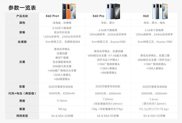 其他方面,三款手機(jī)均配備了一塊6.5英寸屏幕,其中X60為直屏設(shè)計(jì),X60 Pro和X60 Pro+為曲面屏設(shè)計(jì),三者刷新率均高達(dá)120Hz,擁有240Hz高采樣率。電池配置上,X60 Pro+配備了4200mAh電池,支持55W閃充;X60 Pro采用4200mAh電池,支持33W閃充;X60擁有4300mAh電池,支持33W閃充。
