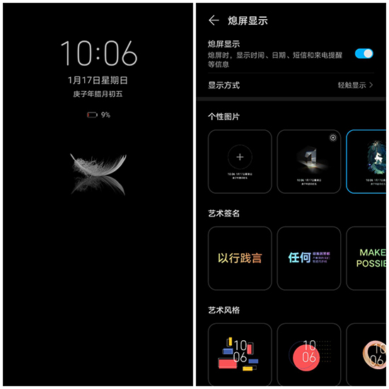 首先是影音娛樂方面,Magic UI 4.0支持AOD精彩自定義,也就是息屏顯示自定義,在“桌面與壁紙”設(shè)置中我們可以 看到“息屏顯示”功能,里面可以設(shè)置自己喜歡的息屏顯示風(fēng)格,包含了個性圖片、藝術(shù)簽名、藝術(shù)風(fēng)格、表盤時鐘以及數(shù)字時鐘等,前三種都可以自定義內(nèi)容,特別是藝術(shù)風(fēng)格的息屏色彩搭配還可以通過手機(jī)拍攝物體提取顏色,例如根據(jù)今天的穿搭來選擇息屏的色彩搭配風(fēng)格。