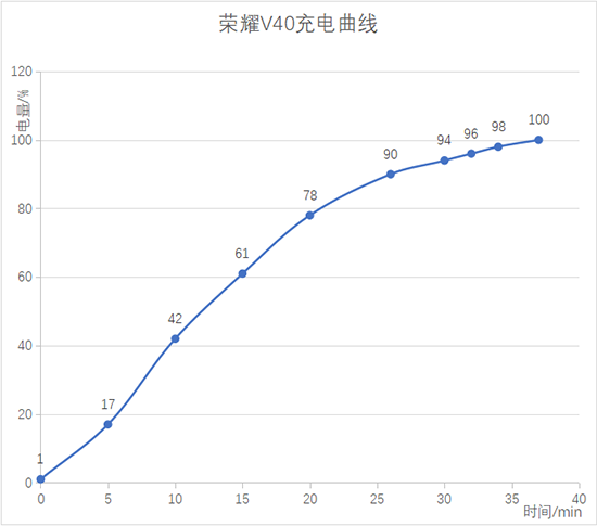 通過測試結果我們可以看到,榮耀V40在有線充電的情況下可以達到5分鐘充電17%,15分鐘充電61%,大約26分鐘的時候就充到了90%,隨后進入涓流充電,最終在37分鐘左右充滿。這次主要得益于三極耳快充方案的采用,速度提升的同時也保護了電池。