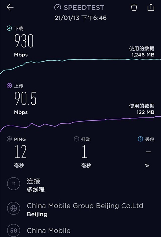 Speedtest實(shí)際測(cè)試其5G下載速率為930Mbps/s,上行速率為90.5Mbps/s