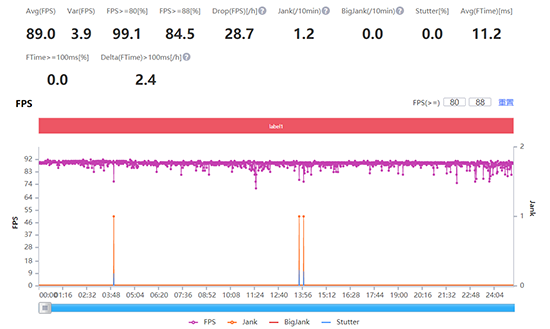 對(duì)于《和平精英》,目前榮耀V40只支持60幀,我們借助第三方應(yīng)用解鎖了90幀+流暢畫質(zhì)。該模式下,榮耀V40表現(xiàn)整體平穩(wěn),平均幀率達(dá)到89fps,略有波動(dòng)但幾乎感知不到。