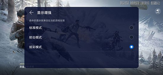 又比如針對設(shè)計類游戲的“顯示增強”,除了標(biāo)準(zhǔn)模式外,還有射擊模式和炫彩模式供選擇,增強了和平精英類槍戰(zhàn)游戲顯示畫面。