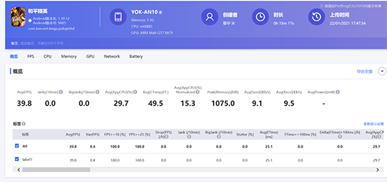 可以看出整場(chǎng)游戲下來,評(píng)論幀率為39.8、抖動(dòng)為0.4,表現(xiàn)非常不錯(cuò),開鏡、射擊、驅(qū)車等多種場(chǎng)景都非常順暢。