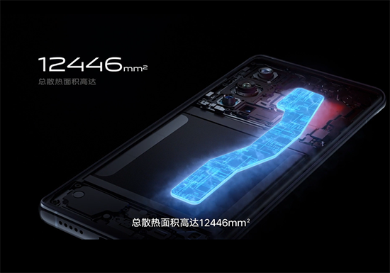由于性能鐵三角的超強性能給手機的散熱也帶來了很大壓力,vivo X60 Pro+用上了超導靈感水冷散熱方案,散熱總面積達到了12446m2,確保手機的性能火力全開不降頻。
