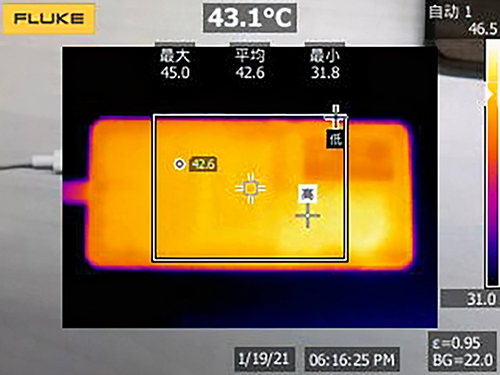 實際測試體驗,在一口氣1小時20分鐘的《王者榮耀》和《和平精英》后,我們用紅外測溫儀測試了手機背面的溫度,平均42.6攝氏度和最高45攝氏度的成績屬于正常水平。