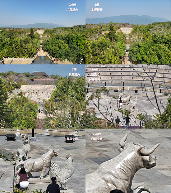 另外三顆鏡頭,一顆為1200萬像素超廣角,一顆為1000萬像素3倍光學(xué)變焦,最后一顆為1000萬像素10倍光學(xué)變焦的潛望式長焦鏡頭。這三者的像素規(guī)格與主攝9合1之后的1200萬像素接近,組合起來整套相機(jī)模組能實(shí)現(xiàn)0.6倍、1倍、3倍、10倍光學(xué)變焦,再加上拓展起來的30倍和100倍數(shù)碼變焦。